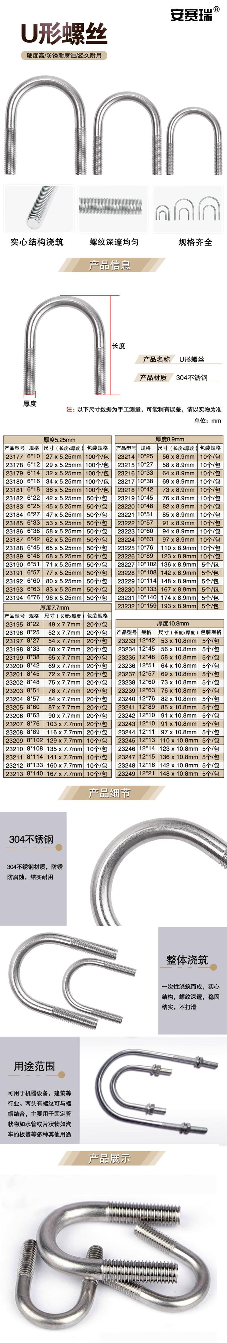 安赛瑞 不锈钢U型螺丝 304不锈钢U型螺丝U型卡 骑马卡管道卡箍 U型螺栓 6×60mm(50个装) 23192