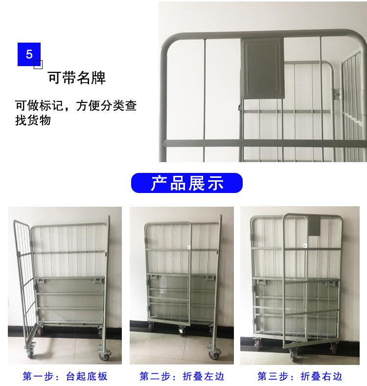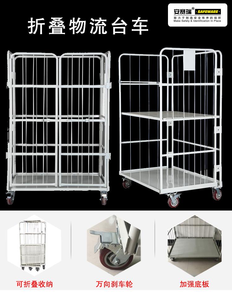 4 功能实用:支持折叠存放,节省仓储空间;可带名牌标识,方便分类查找货物;搭配物流台车的万向刹车轮,移动灵活且停靠安全