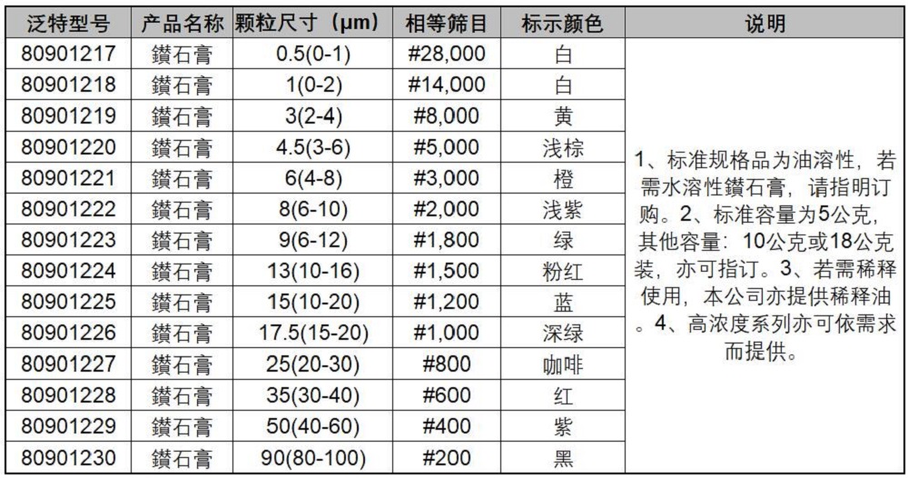 6 差异化优势:相比同类产品,该鑚石膏具有更细的颗粒和更高的筛目,适合对表面光洁度要求极高的应用场景。