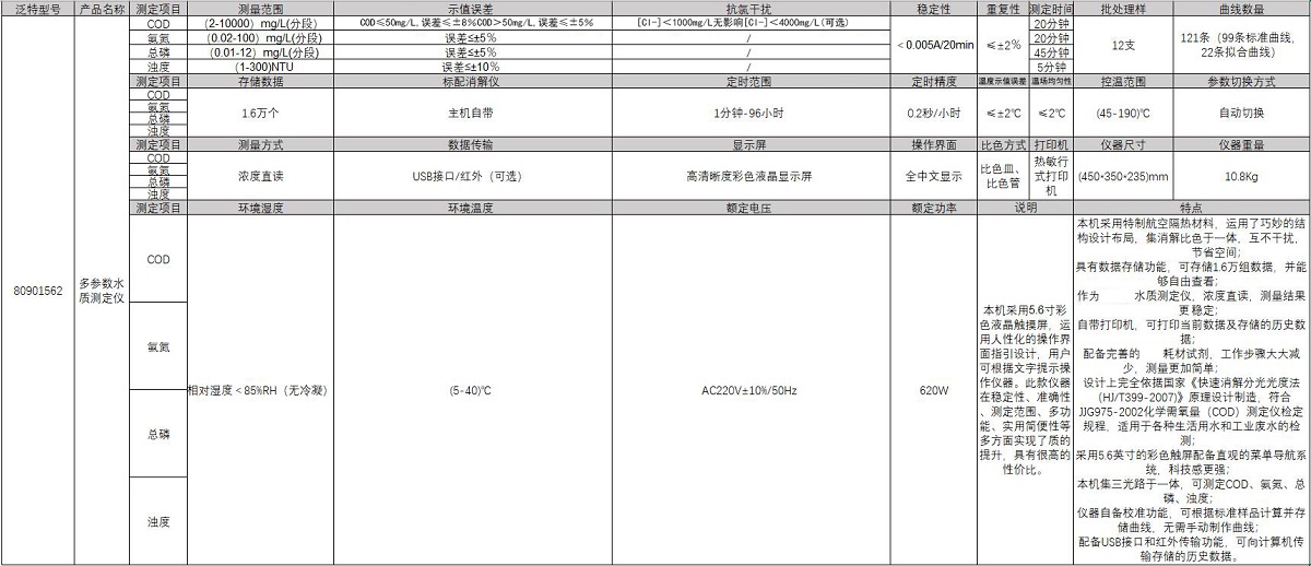 宽量程高精度:氨氮0.005-1000mg/L(分段)精度≤±8%,总磷0.01-12mg/L(分段)精度≤±5%,浊度0-1300NTU精度≤±8%,COD 0-10000mg/L(分段)精度≤±5%,抗氯干扰能力强(Cl⁻<1000mg/L无影响、1000-4000mg/L可测)