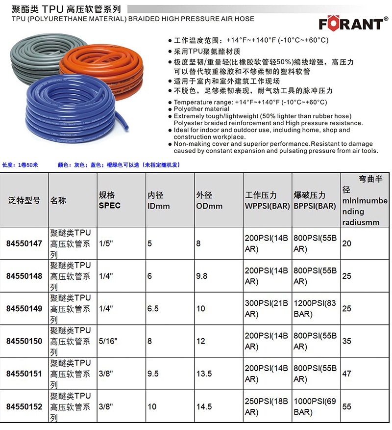 Forant(泛特) 84550151 聚醚类TPU高压软管系列 规格:3/8〞