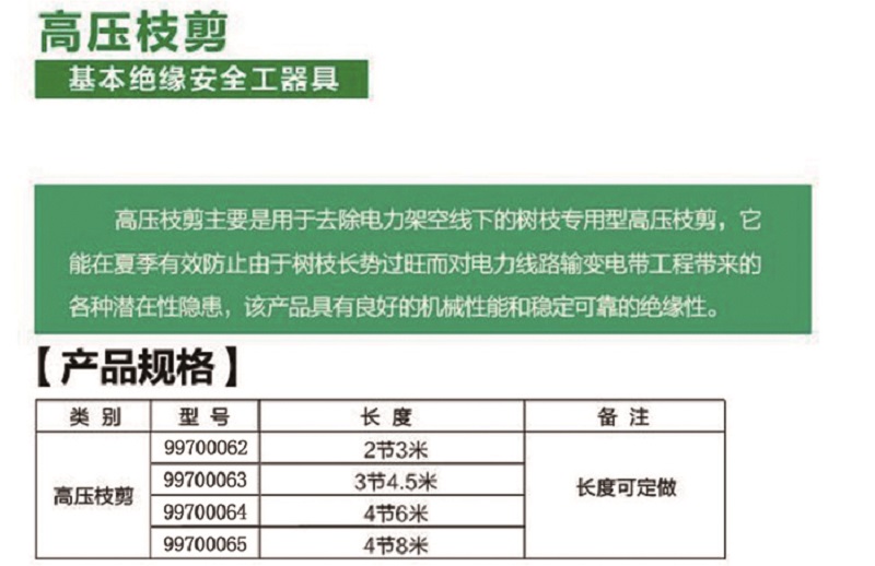 1 使用前必须检查高压枝剪的绝缘层是否完好无损,有无裂纹、老化或破损现象,严禁使用存在绝缘缺陷的产品。
