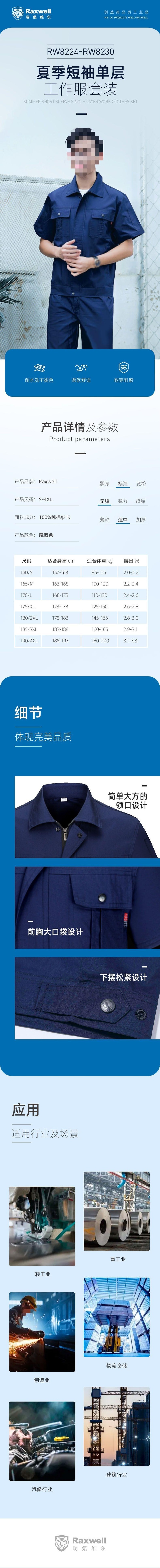 设计特点:夏季短袖单层设计,藏蓝色外观;领口简洁大方,前胸大口袋便于存放小工具,下摆松紧设计贴合身形