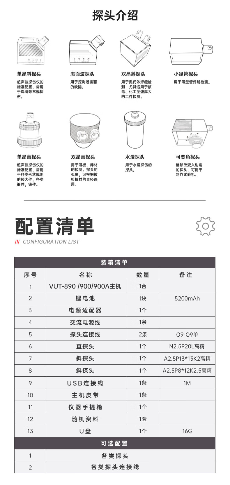 专业探头配置:提供单晶斜探头、表面波探头、双晶斜探头等多种探头,满足不同检测需求。