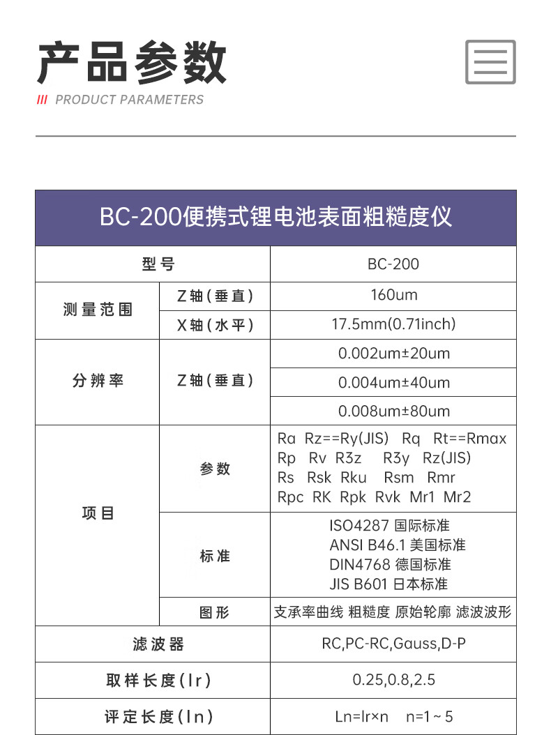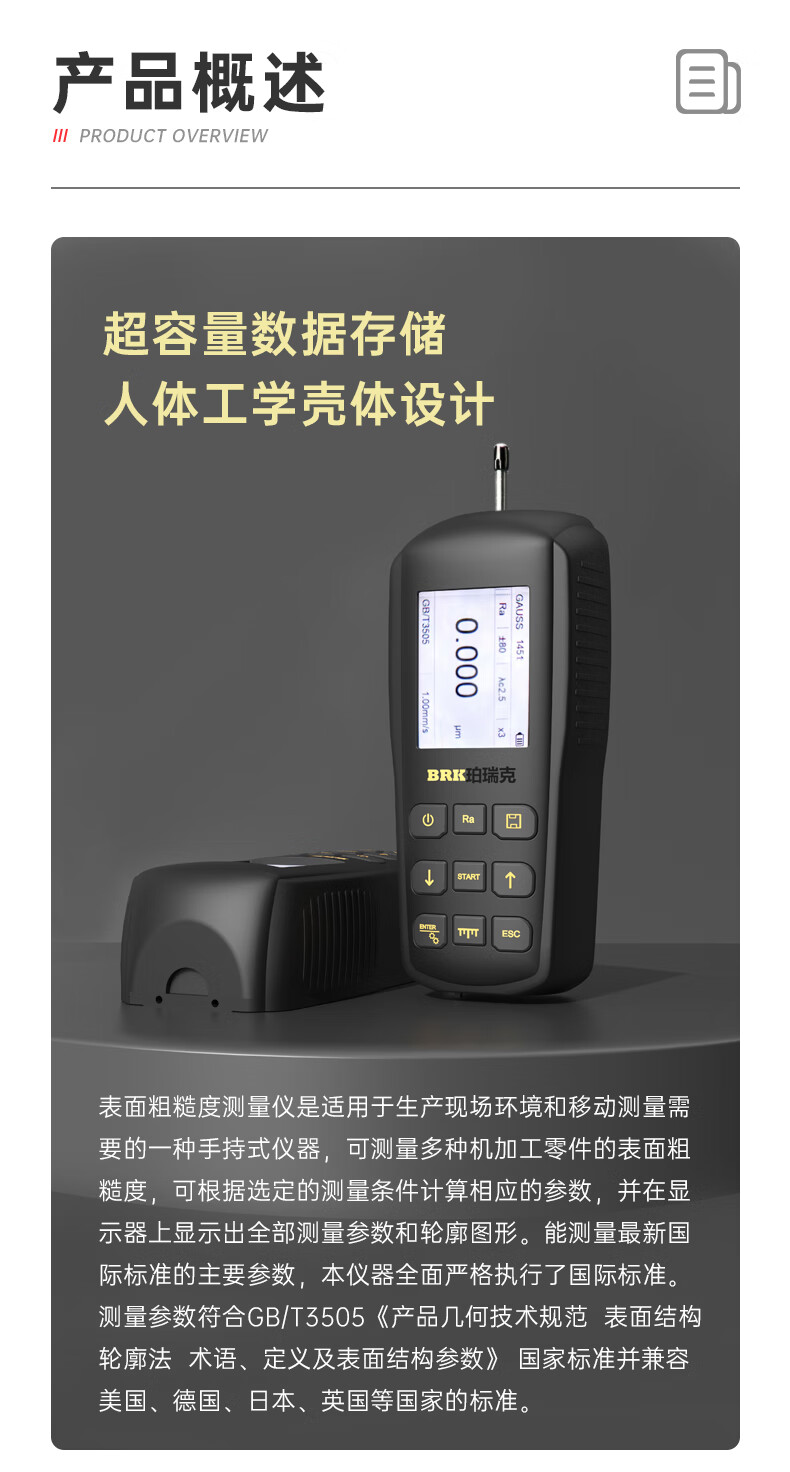 测量参数丰富,涵盖Ra、Rz、Rp、Rv等多种指标,符合ISO、ANSI、DIN、JIS等多国标准