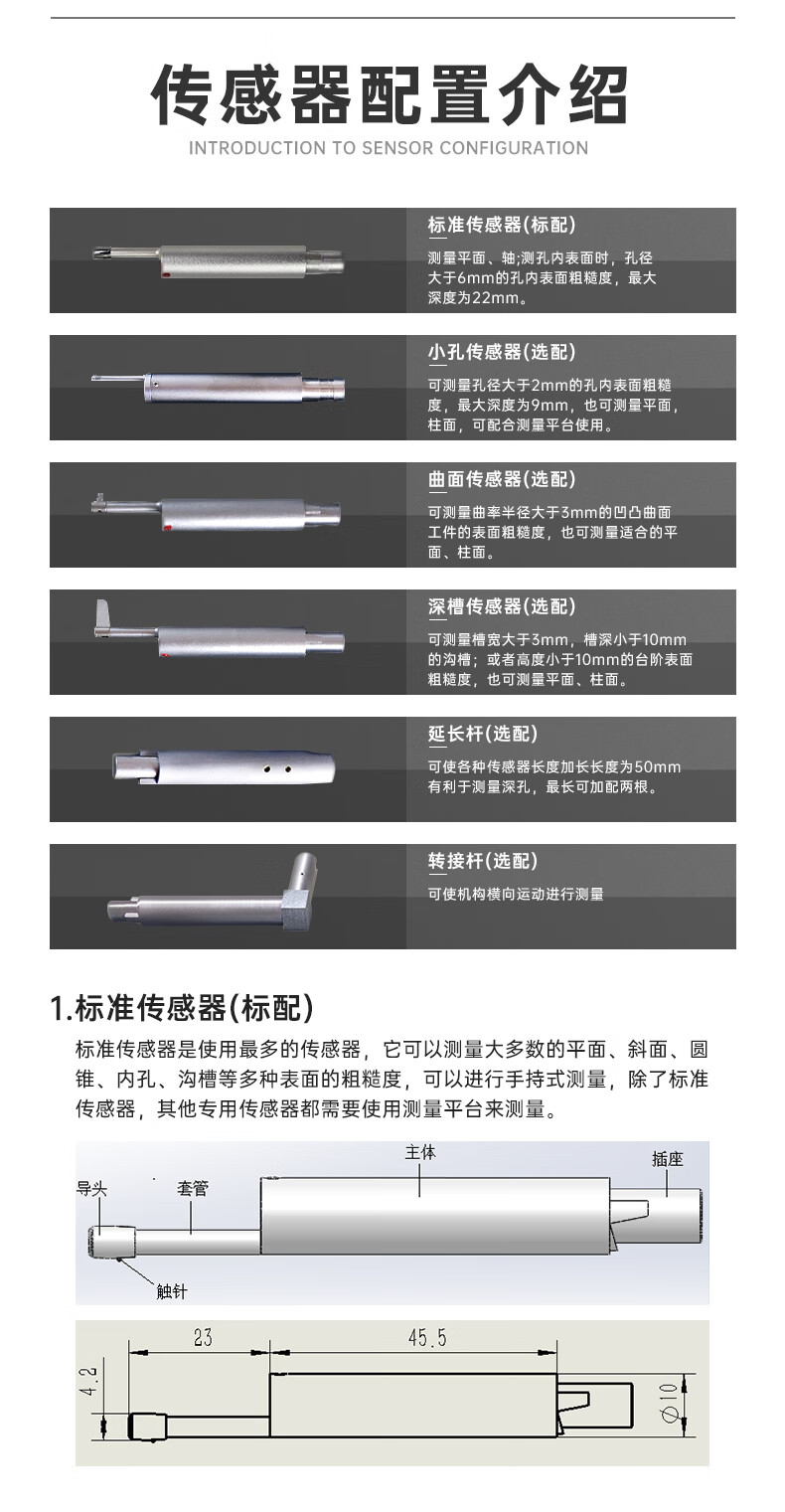 标配标准传感器,可选配曲面、小孔、深槽等专用传感器,适配不同测量场景