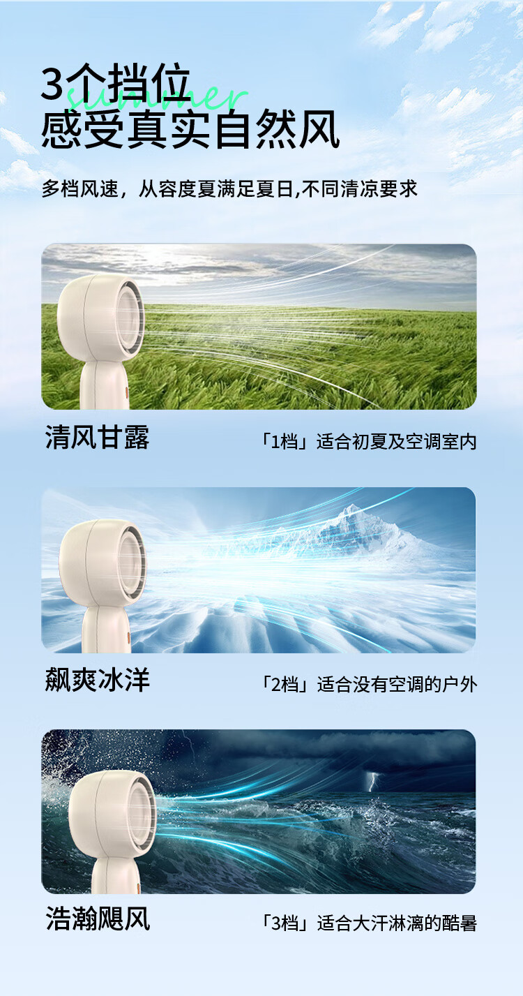 3 **三档风速调节**:提供清风甘露、飒爽冰洋、浩瀚飓风三种模式,满足不同环境下的清凉需求,从初夏到酷暑都能应对自如。