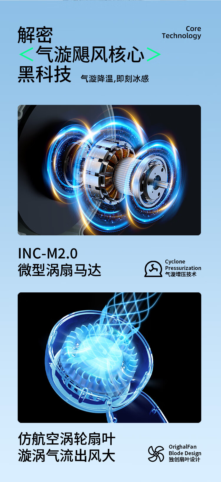 2 **INC-M2.0微型涡扇马达**:搭载仿涡轮扇叶设计,实现漩涡气流,风力强劲且稳定,提供即时冰感降温体验。