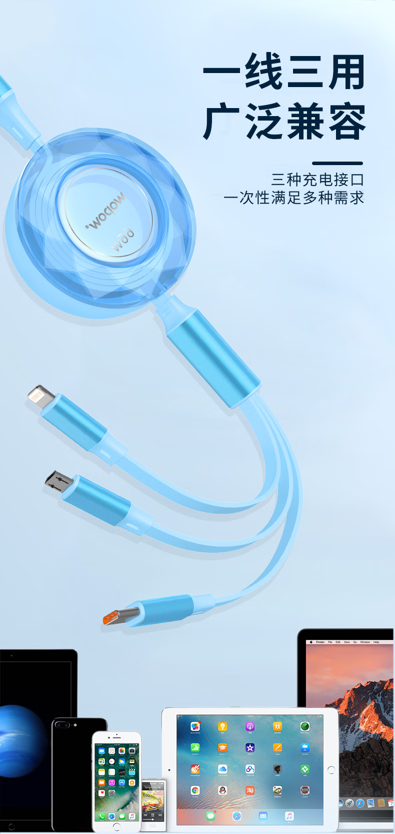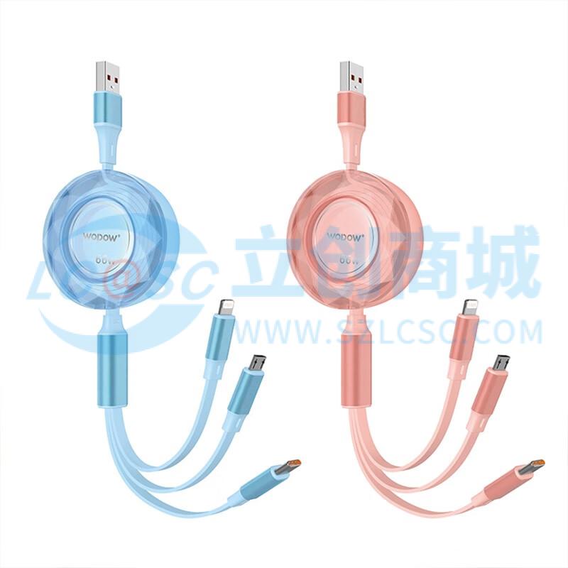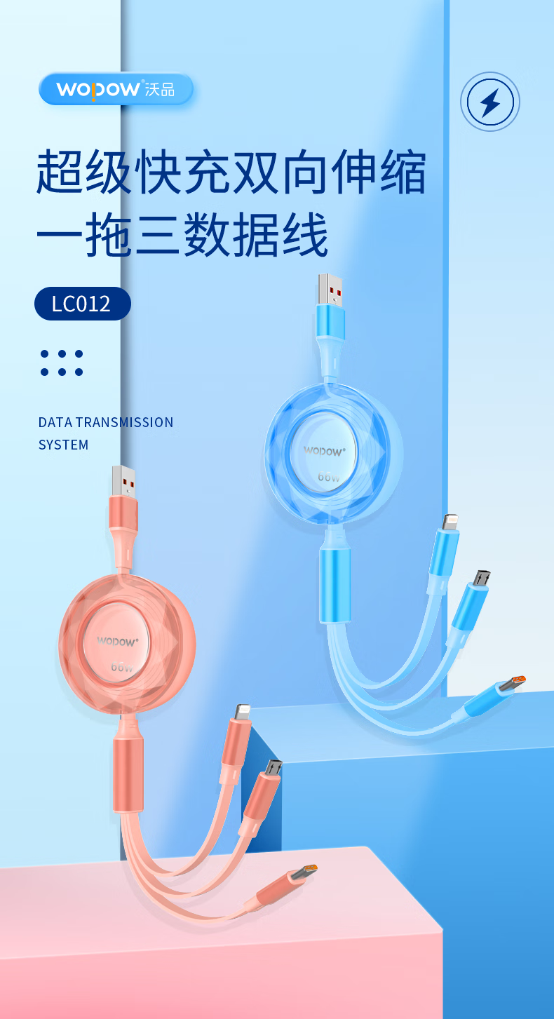 沃品(WOPOW) LC012-P超级快充双向伸缩一拖三数据线可调节拉伸快充线三合一便携车载数据线 粉色 1.2米