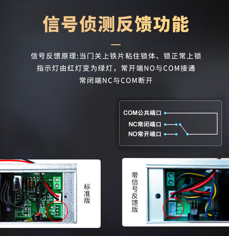 4 信号反馈功能:当门关上铁片粘住锁体、锁正常上锁时,指示灯由红灯变为绿灯,常开端NO与COM接通,常闭端NC与COM断开,实现精准的信号反馈。