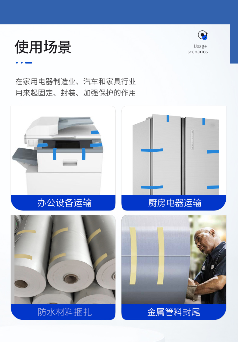 5 高粘接力:对钢表面的粘接强度达到6.7 N/cm,适用于多种材质的捆扎需求。