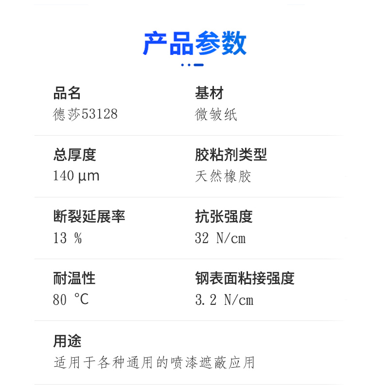 tesa 53128是一款薄且柔软的标准遮蔽胶带,具有以下特点: