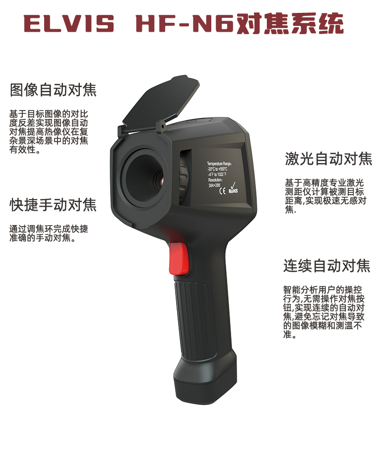 智能功能:激光自动对焦+图像自动对焦,激光测距(有效距离达50m),本机分析功能(距离/面积/长度测量、温升显示、相间温差计算、分区发射率设置)