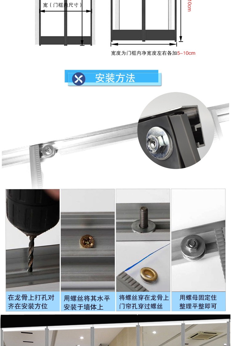 **安装步骤**:按照说明书进行操作,先在龙骨上打孔对齐安装方位,再用螺丝将其水平安装于墙体上,最后将门帘孔穿过螺丝并用螺母固定。
