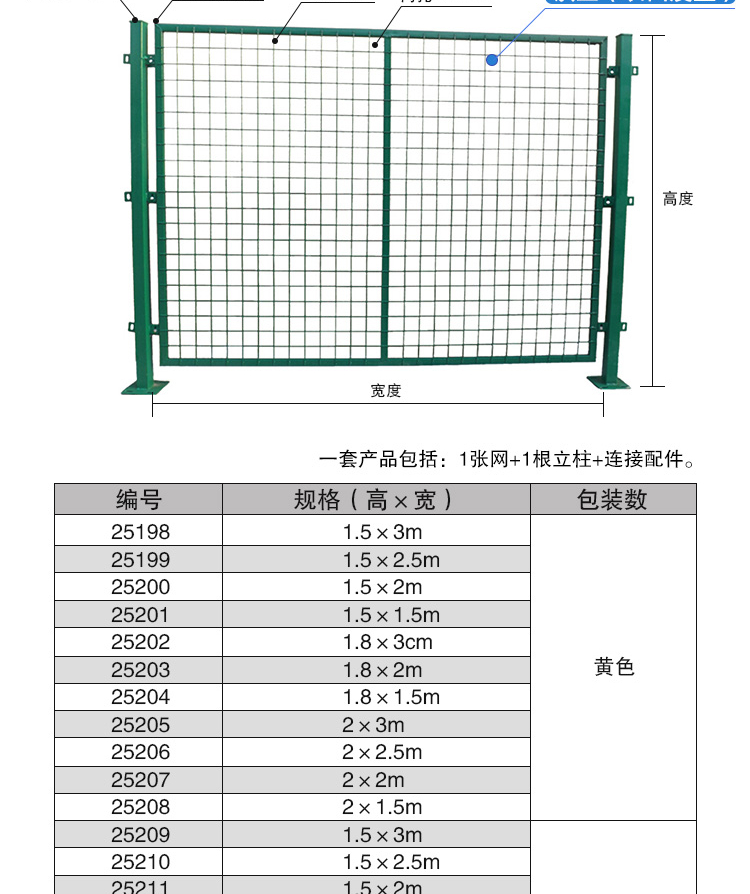 规格参数:型号25201,单套尺寸1.5m×1.5m,包含1张网+1根立柱+连接配件