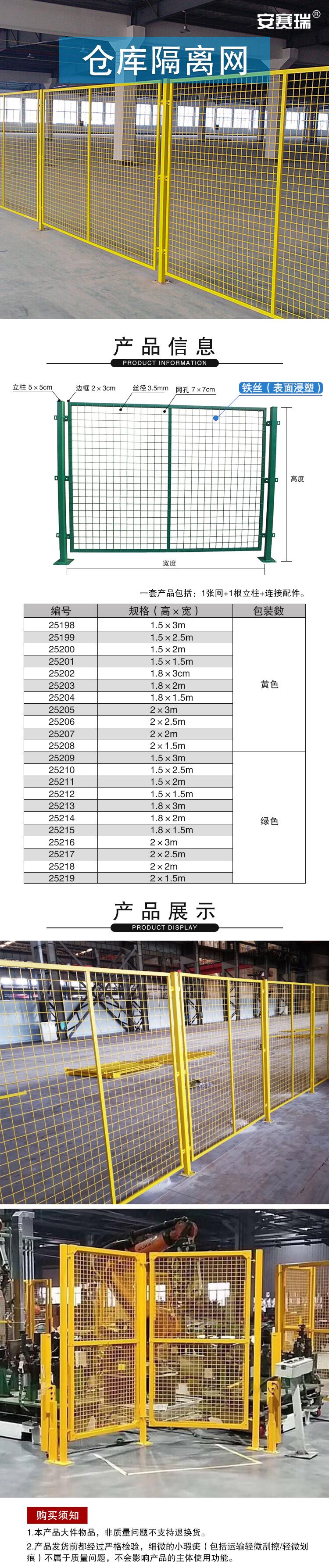安赛瑞 仓库隔离网 工厂车间设备安全隔断栅栏 快递分拣铁丝网 一张网一根柱高1.8m宽3m绿色 25213