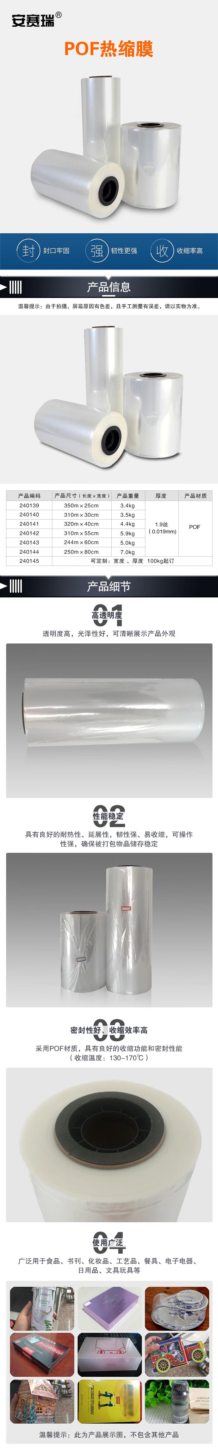 密封性好、收缩效率高:采用POF材质,具有良好的收缩功能和密封性能,收缩温度为130-170℃,能够有效保护产品免受外界环境影响。