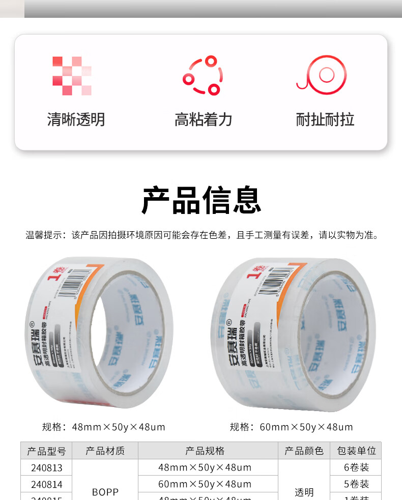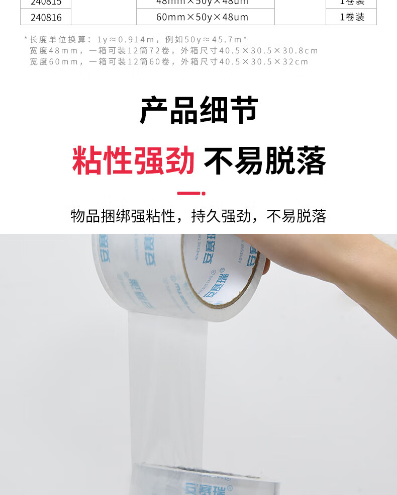 规格为48mm×50y×48um(50y≈45.7m),1卷装,满足日常及小批量打包需求