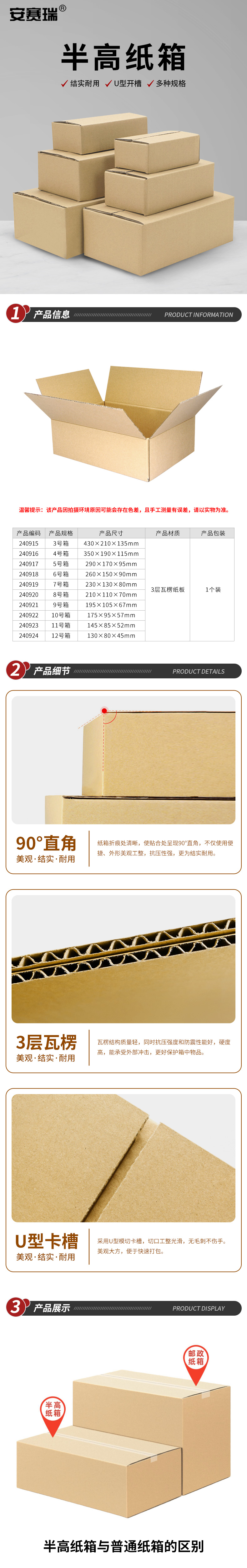 品牌为安赛瑞,型号240915,属于3号半高纸箱,内尺寸430×210×135mm,采用3层瓦楞纸板材质,加硬处理,承重性能较好