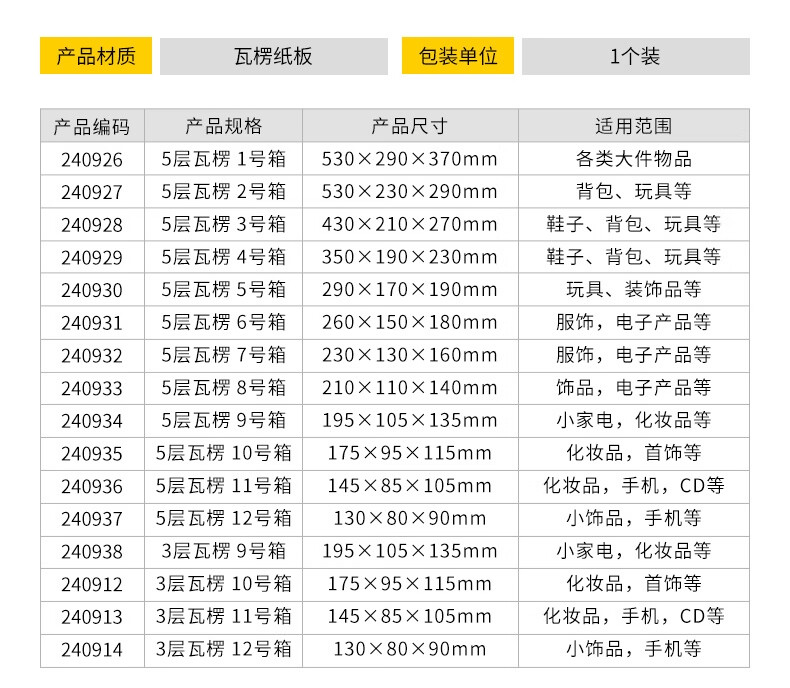 提供多种标准化规格可选(如4号箱35×19×23cm、3号箱43×21×27cm等),满足不同包装需求