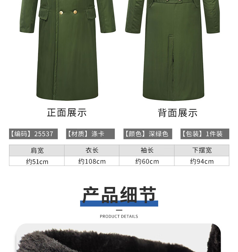设计独特:深绿色外观设计,既时尚又耐脏,适合多种工作环境。过膝长度设计,有效保护腿部免受寒风侵袭。