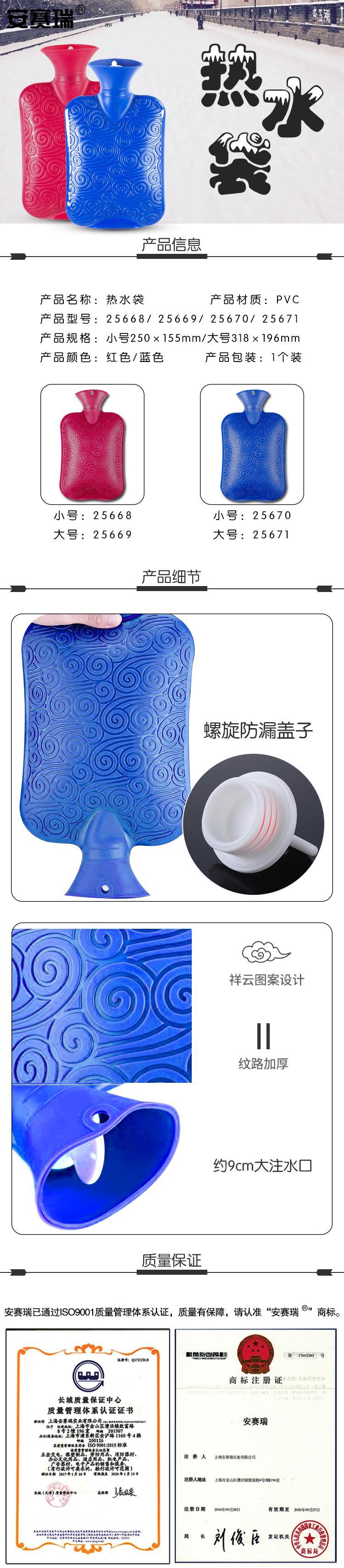 安赛瑞热水袋型号25670采用优质PVC材质制成,具有良好的柔韧性和耐用性,加厚设计有效提升耐压能力,防止爆裂。产品容量为1000ml,适合注水使用,提供持久温暖。表面采用祥云图案浮雕设计,不仅美观大方,还增加了握持时的摩擦力,防止滑脱。配备螺旋防漏盖子,密封性能优异,有效防止漏水,确保使用安全。注水口直径约9cm,方便快速注水和清洁。整体尺寸为318×196mm,属于大号规格,适用于暖手、暖脚、暖身等多种需求。产品通过ISO9001质量管理体系认证,品质可靠,值得信赖。