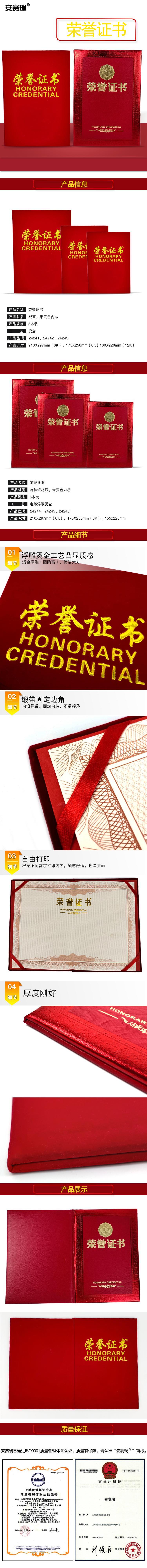 安赛瑞 荣誉证书(5本装)横款绒面荣誉证书奖状附赠内芯 红绒烫金6K210x297mm 26433