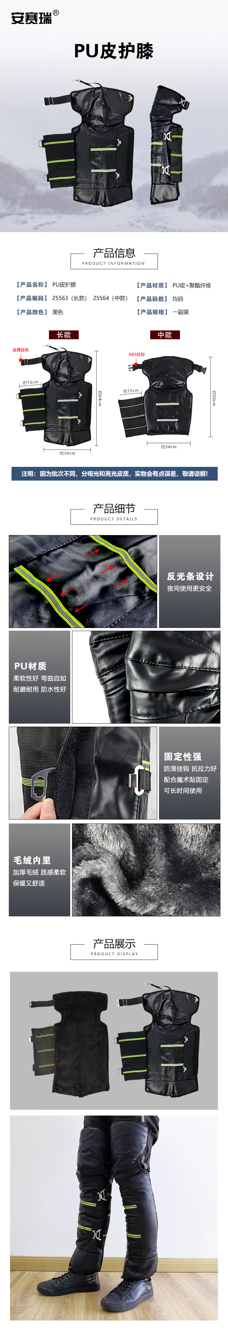 安赛瑞 冬季保暖护膝 反光防寒保暖护具 秋冬户外PU加厚加绒防水护腿全包 25564