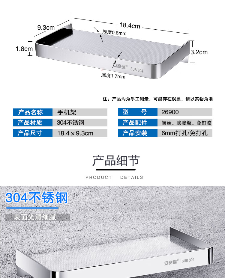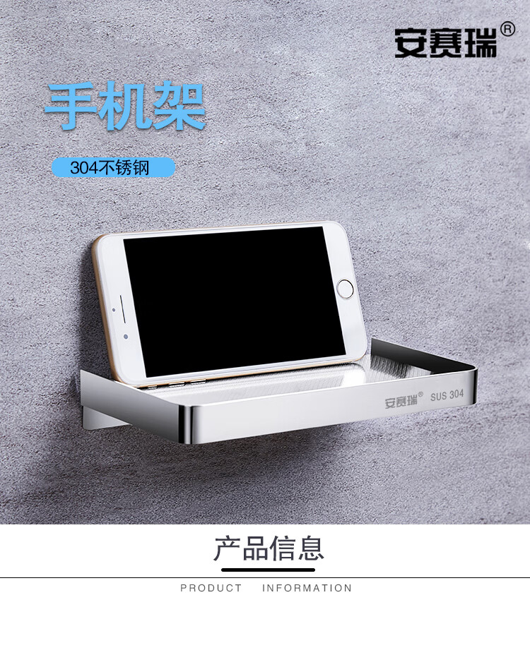 安赛瑞 不锈钢卫生间手机架 304不锈钢浴室卫生间放手机置物架 18.4×9.3cm 26900
