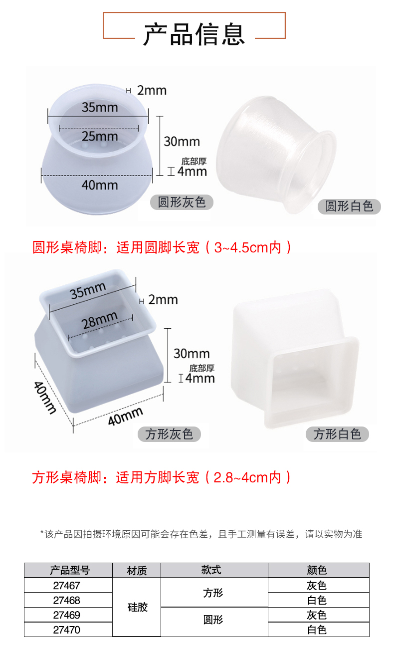 4 圆形款式适配3-4.5cm内的圆形家具脚,尺寸贴合度高