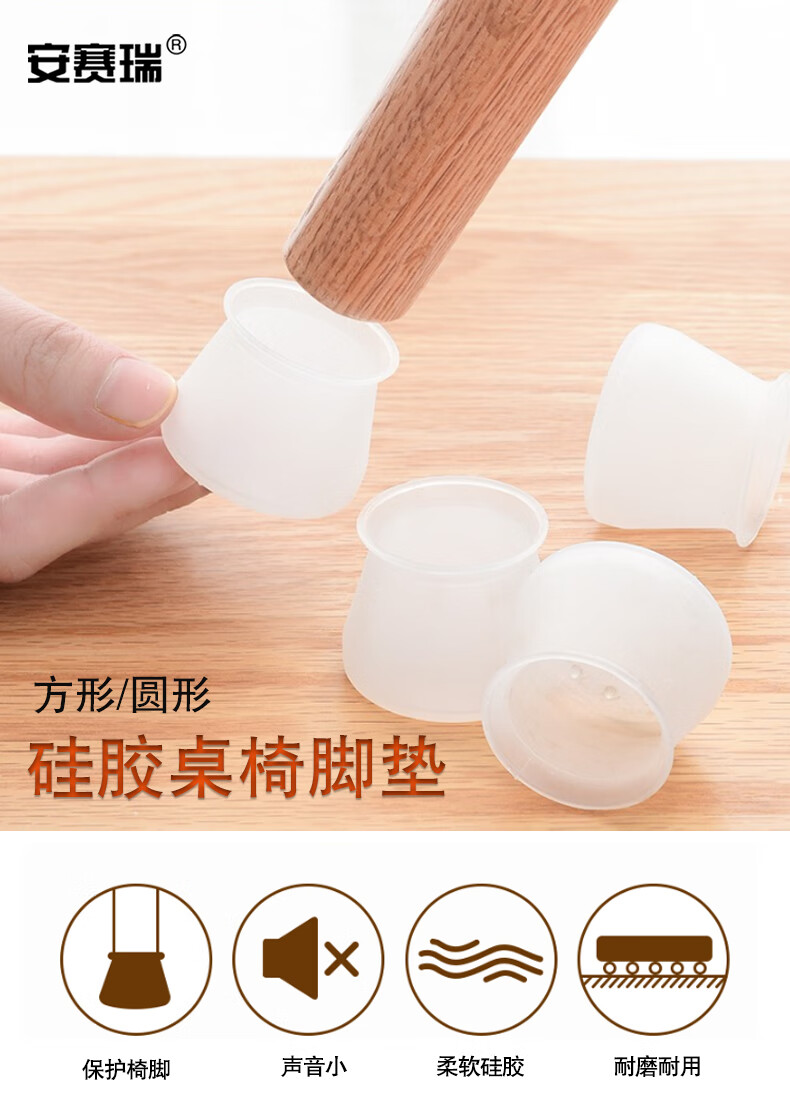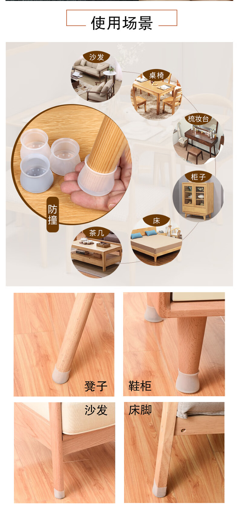 适用于家庭、办公等多种场景下的家具脚部防护,包括但不限于:- 餐桌、餐椅、书桌、办公椅等桌椅类家具