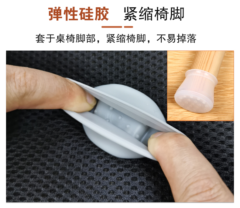 1 材质为硅胶,弹性优异,套于桌椅脚部可紧密收缩固定,不易掉落