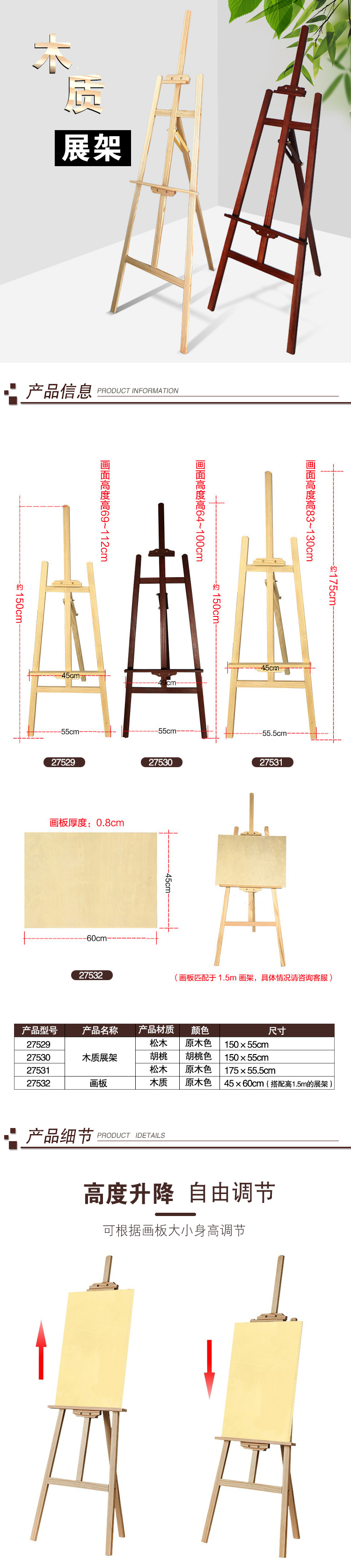 安赛瑞 木质展架 1.75米实木画架 立式kt板展架展板 折叠展示支架 广告宣传展示架 原木色 (不含画板) 27531