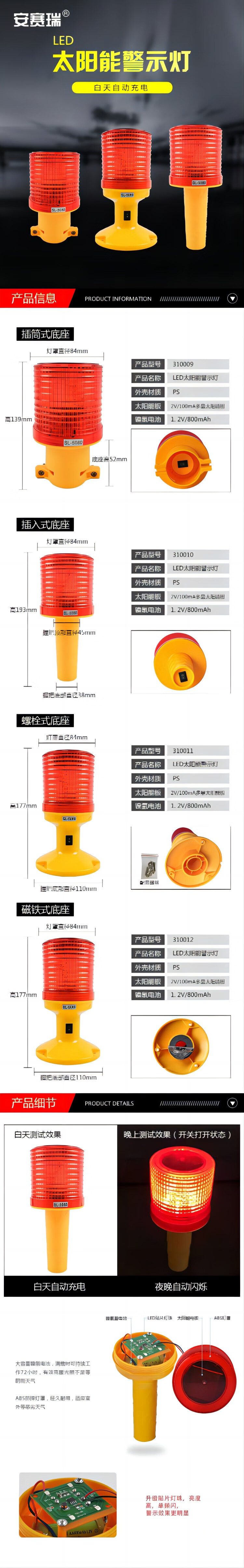 该LED太阳能警示灯广泛应用于市政道路交通、施工工地、路障标识、机场跑道、港口码头等需要安全警示的场合。例如,在市政道路施工中,它可以放置在施工区域周围,提醒过往车辆和行人注意安全;在机场跑道上,它可以帮助飞行员在夜间或低能见度条件下识别跑道边界;在港口码头,它可以用于标记危险区域或引导船舶安全停靠。其强大的警示效果和自供电特性,使其在各种工作条件下都能表现出色,有效保障人员和设备的安全。