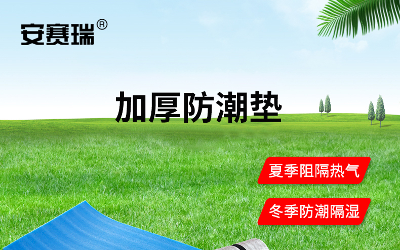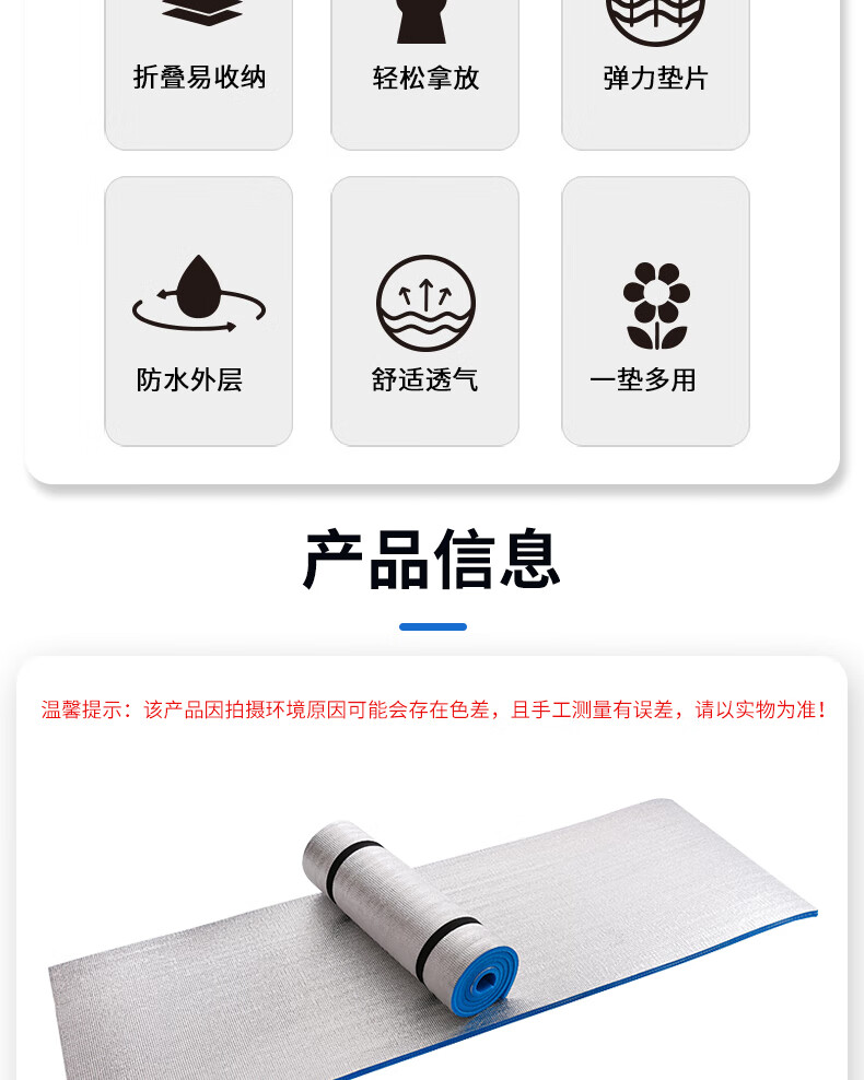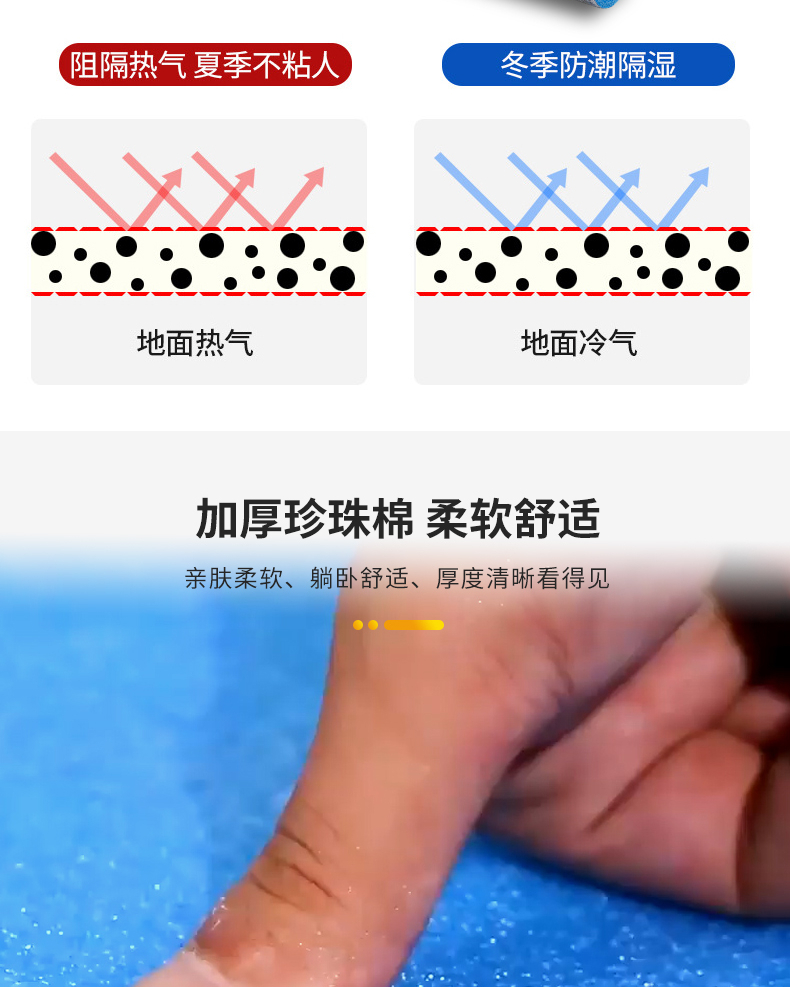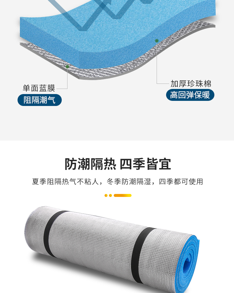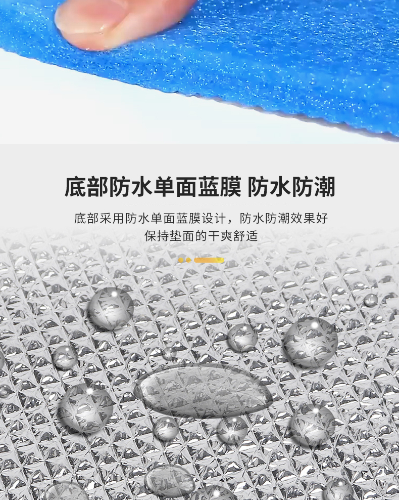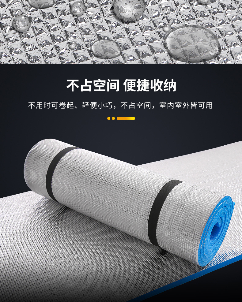 3 防水防潮性能:底部蓝膜设计可阻隔地面潮气与水分,保持垫面干爽;铝箔层能反射热量,夏季隔热不粘人,冬季保暖隔湿,四季适用