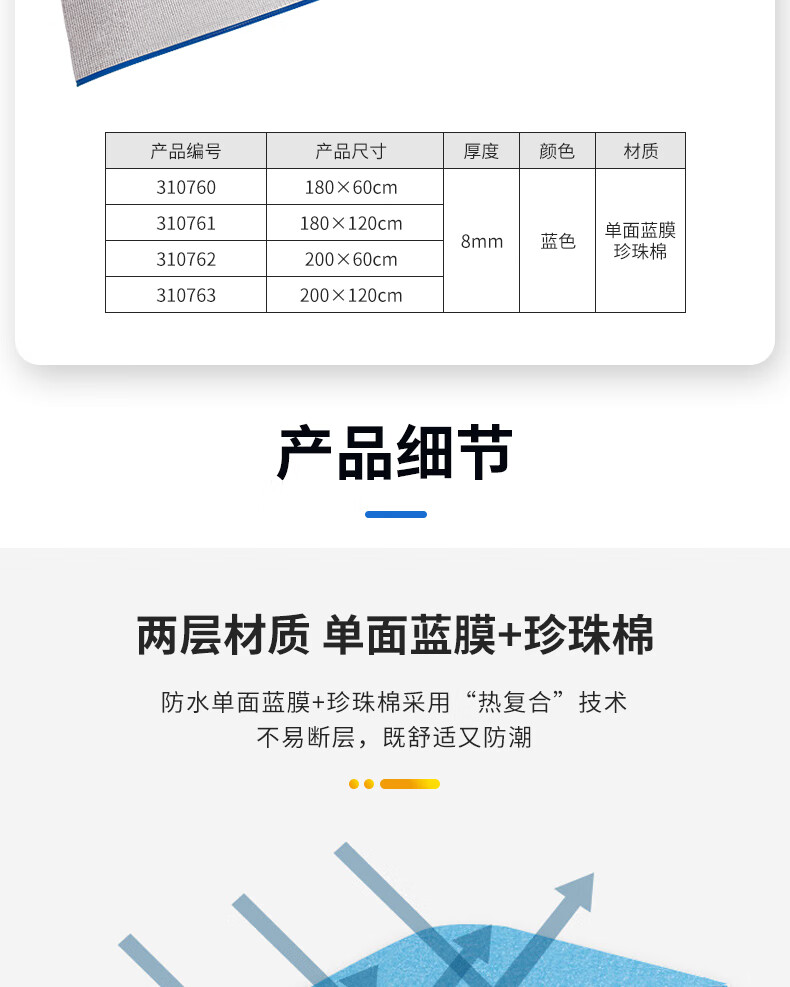 2 复合结构:单面蓝膜+珍珠棉通过热复合技术制成,不易断层,兼具防水防潮与舒适特性