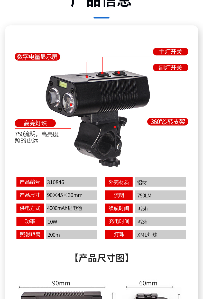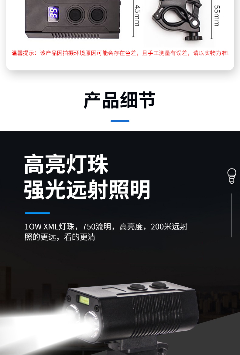 强光远射性能:采用10W XML灯珠,输出750流明亮度,最远照射距离达200米,夜间骑行视野清晰