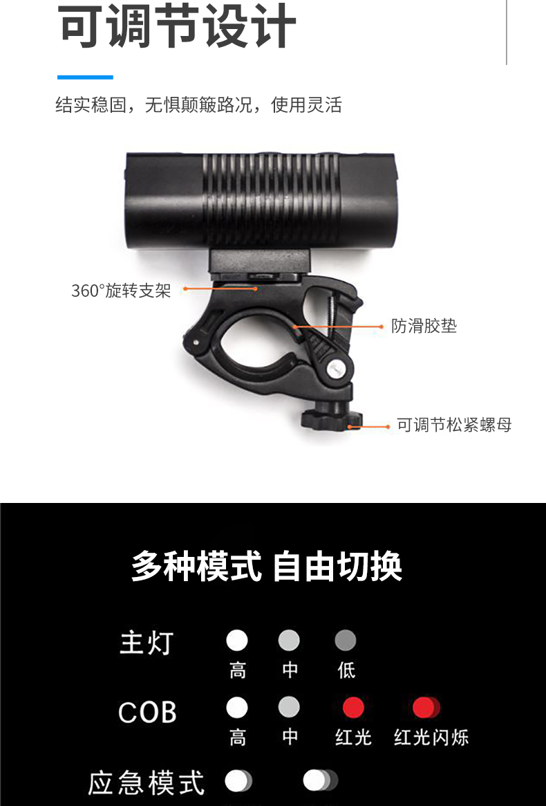 多模式照明:支持主灯高中低亮度、COB高中亮度、红光、红光闪烁及应急爆闪(SOS)模式,适配不同场景