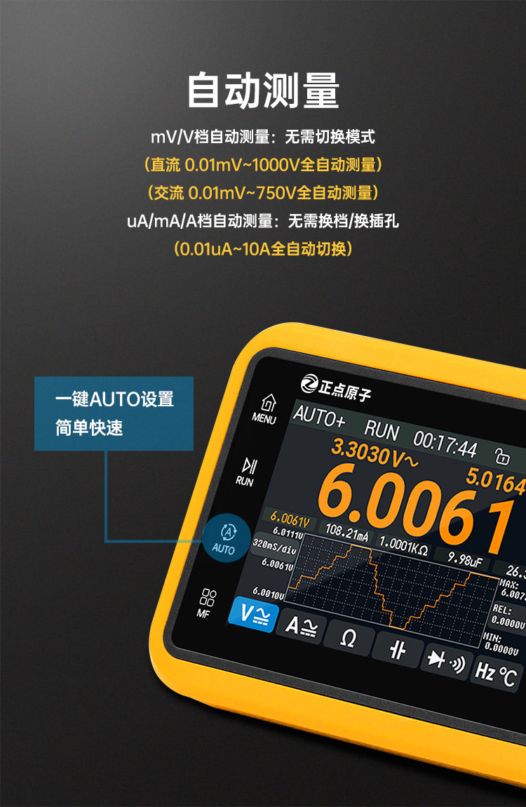 自动测量功能:电压(mV/V档)、电流(uA/mA/A档)全自动切换,无需手动换挡或换插孔