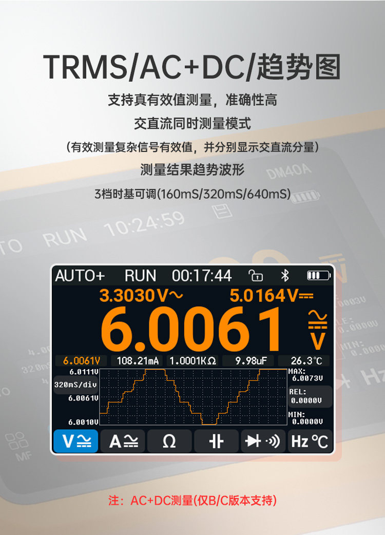 丰富测量能力:支持TRMS真有效值、AC+DC测量、电阻/电容/通断/频率/温度测量,二极管测试