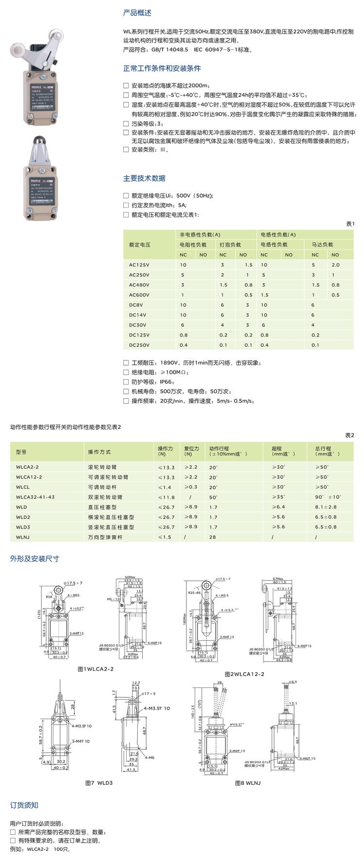 属于WL系列行程开关,符合GB/T 14048.5和IEC 60947-5-1标准