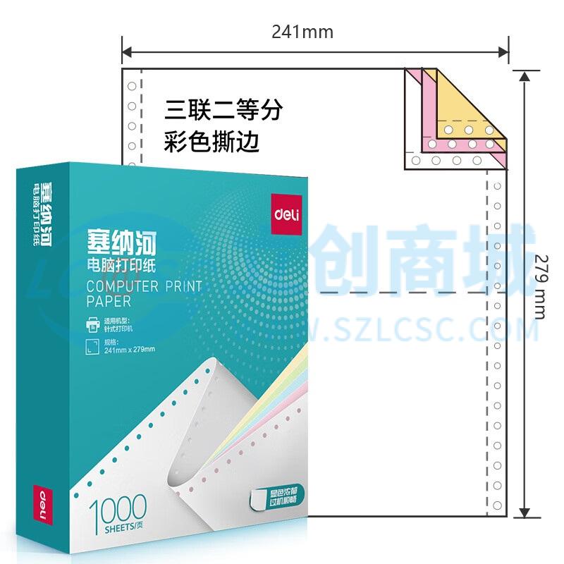 品牌与规格:得力(deli)出品,型号N241 - 5,1/2CS彩色撕边电脑打印纸,1000页/盒,纸张宽度241mm,适配针式打印机。