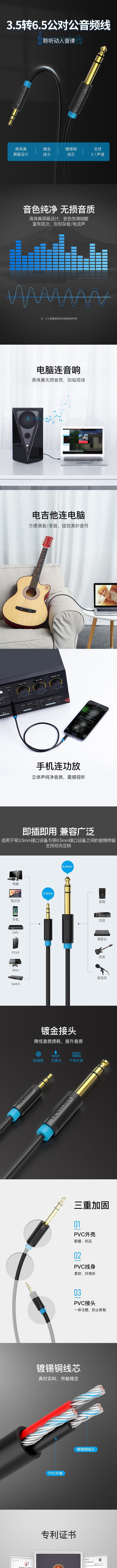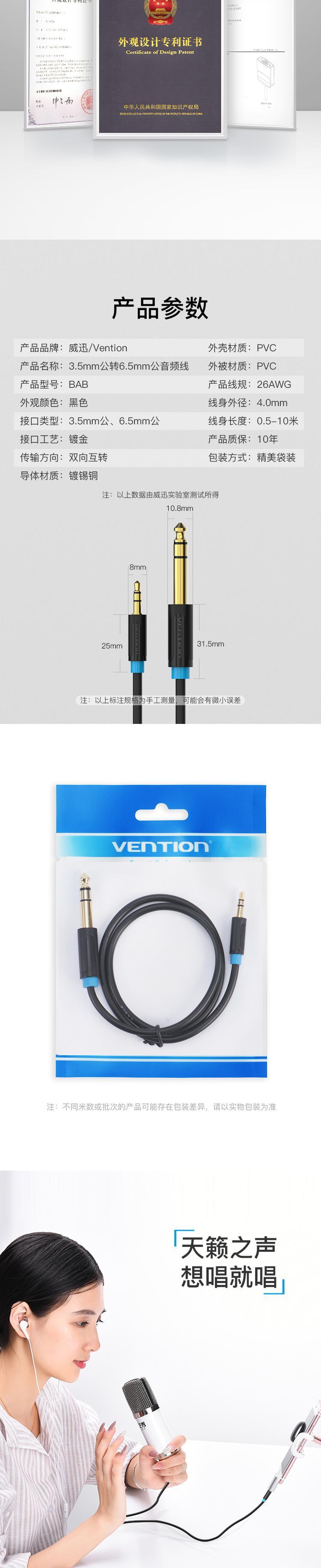 威迅BAB系列TRS 3.5mm公对6.35mm公音频线黑色1.5米