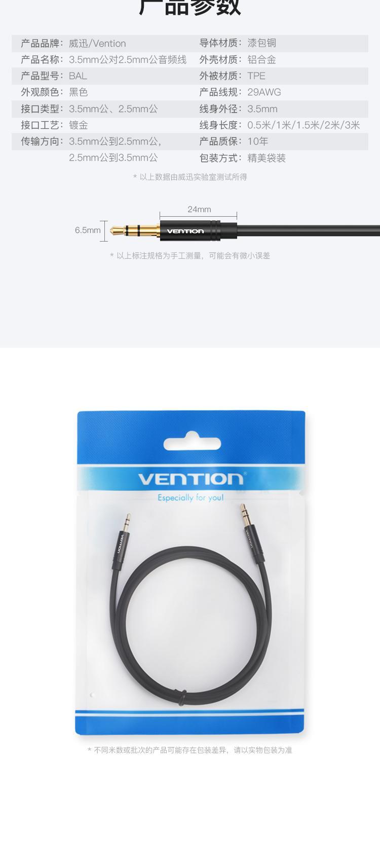 威迅BAL系列3.5公对2.5公音频线金属款黑色0.5米(VAB-A09)