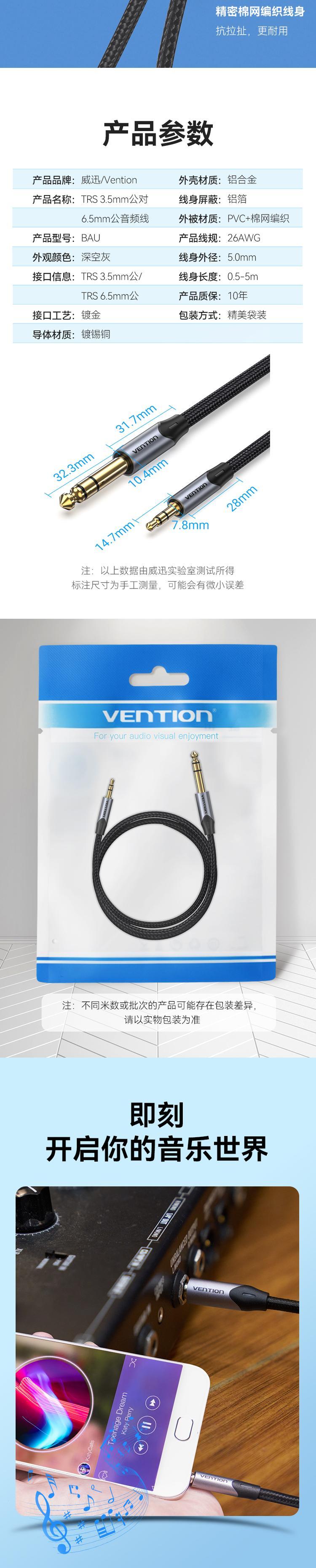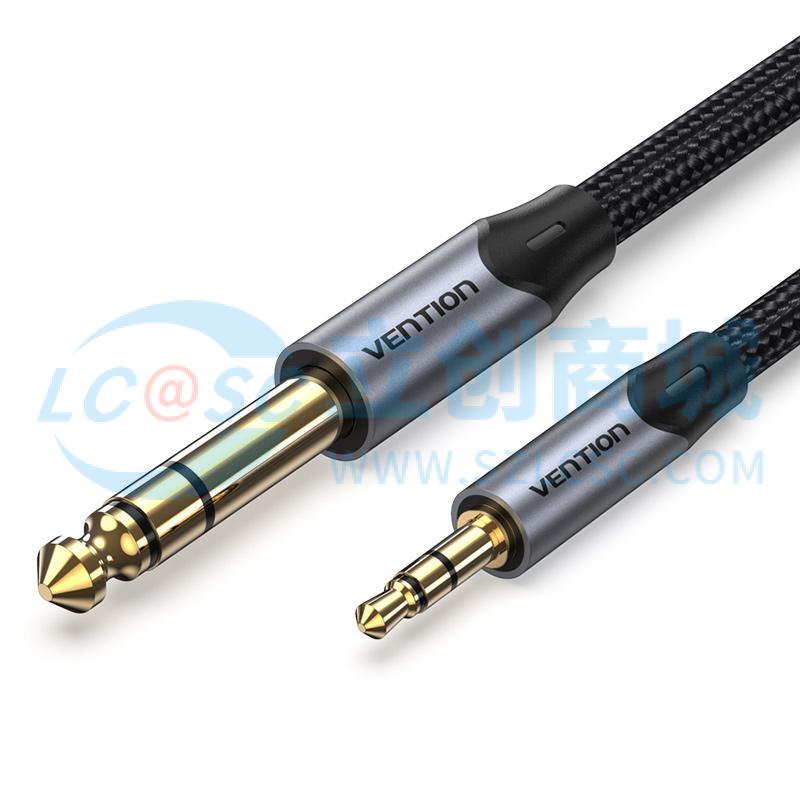 威迅BAU系列TRS 3.5mm公对6.35mm公音频线铝合金款棉网编织灰色3米