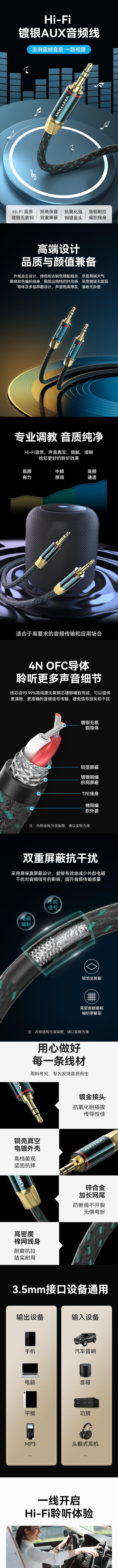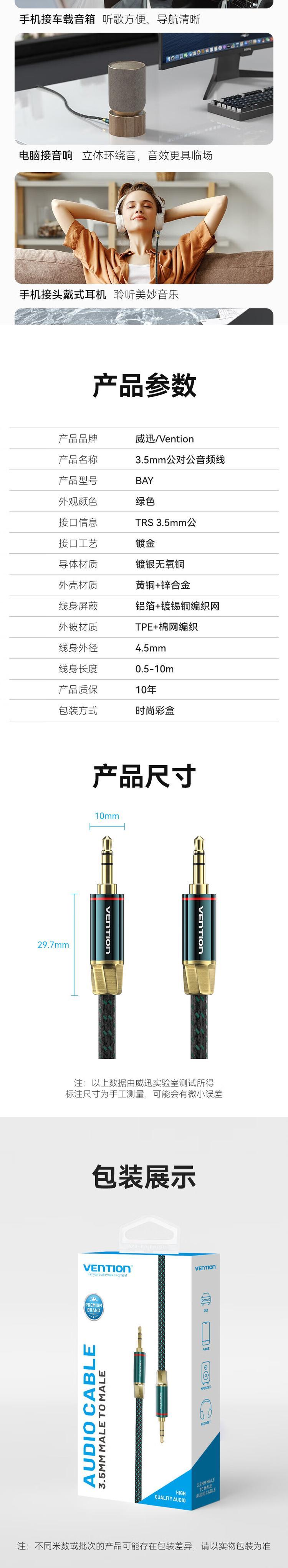 威迅BAY系列3.5mm公对公音频线铜壳款棉网编织绿色0.5米