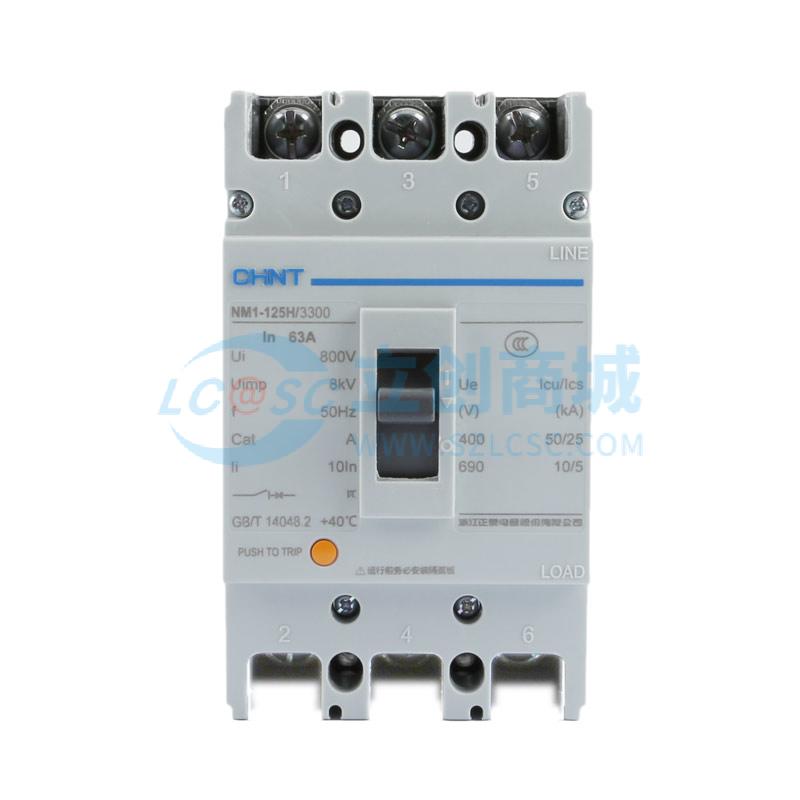 该产品为CHINT(正泰)品牌NM1-125H/3300 63A型号的塑料外壳式断路器,属于NM1系列中较高分断能力(H型)的产品。其主要特点如下: