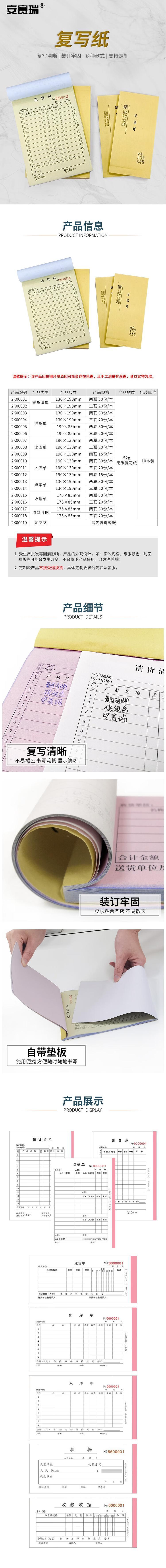 采用无碳复写技术,复写清晰不易褪色,书写流畅显示清晰