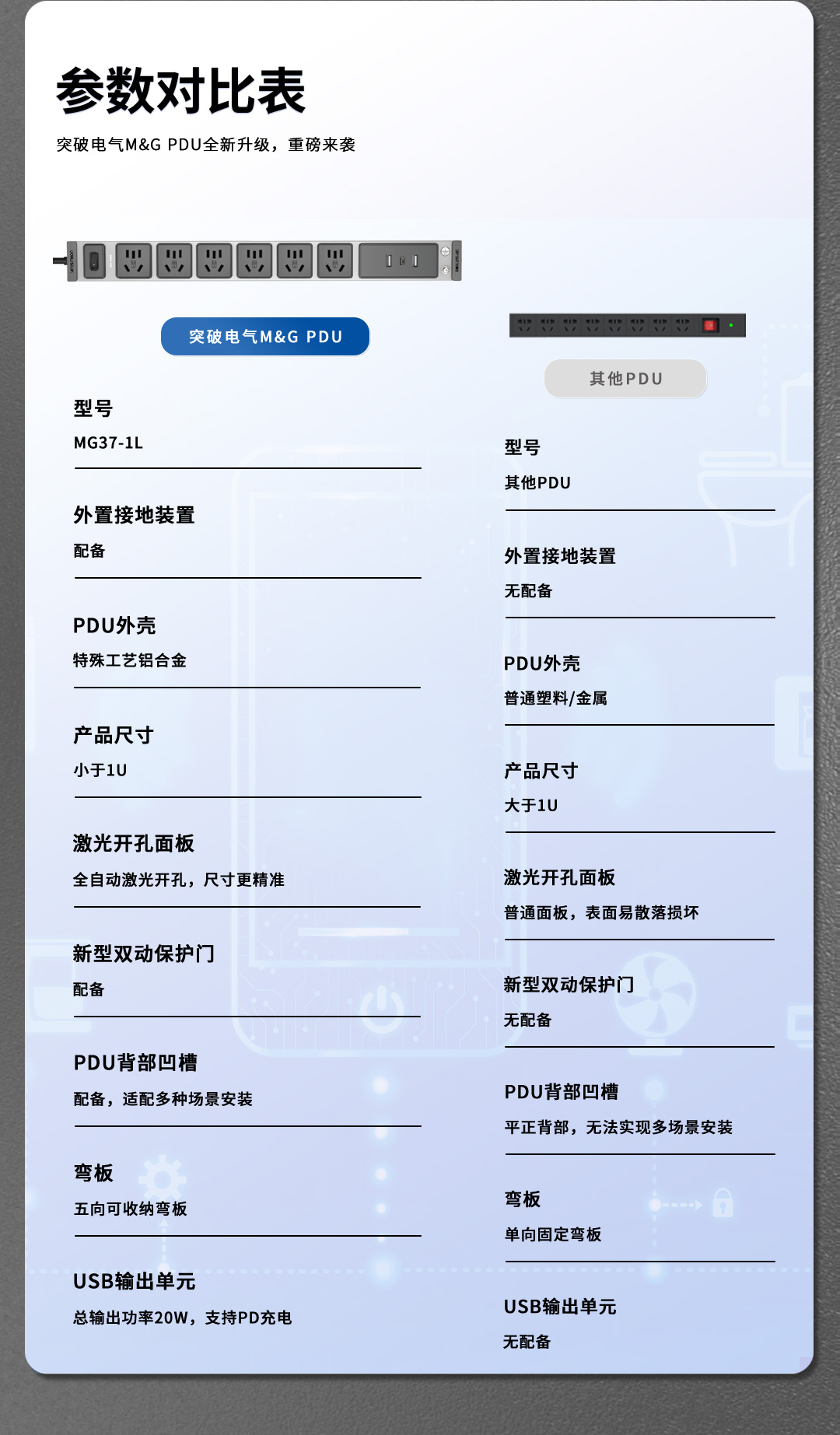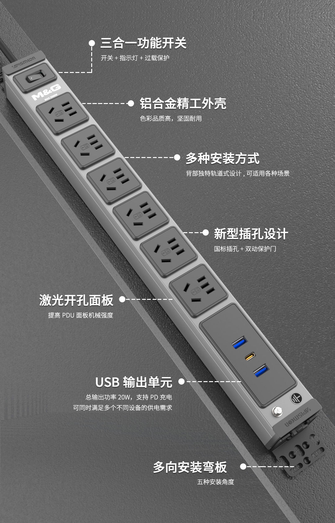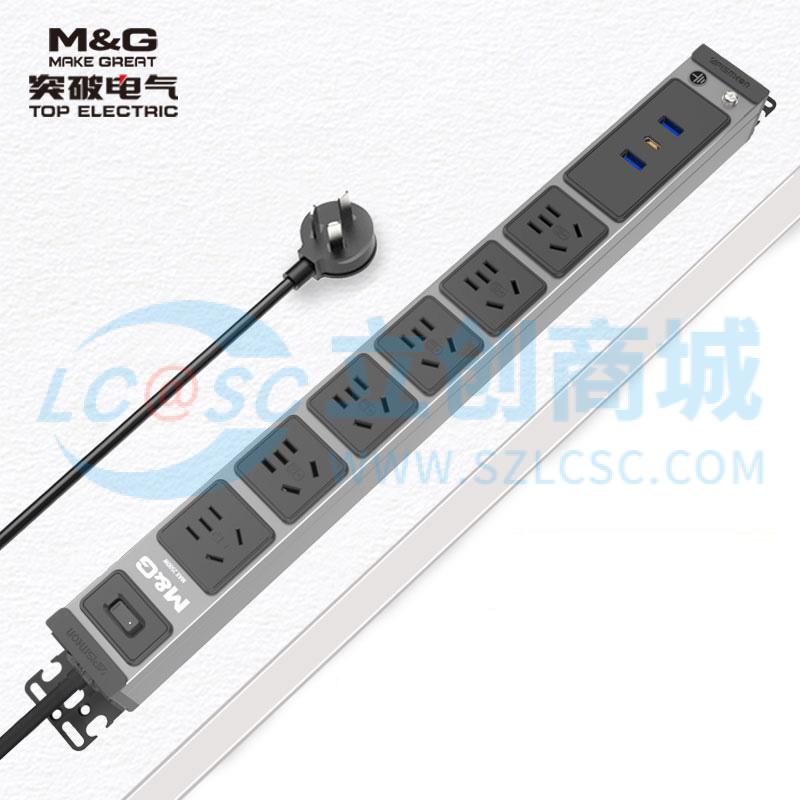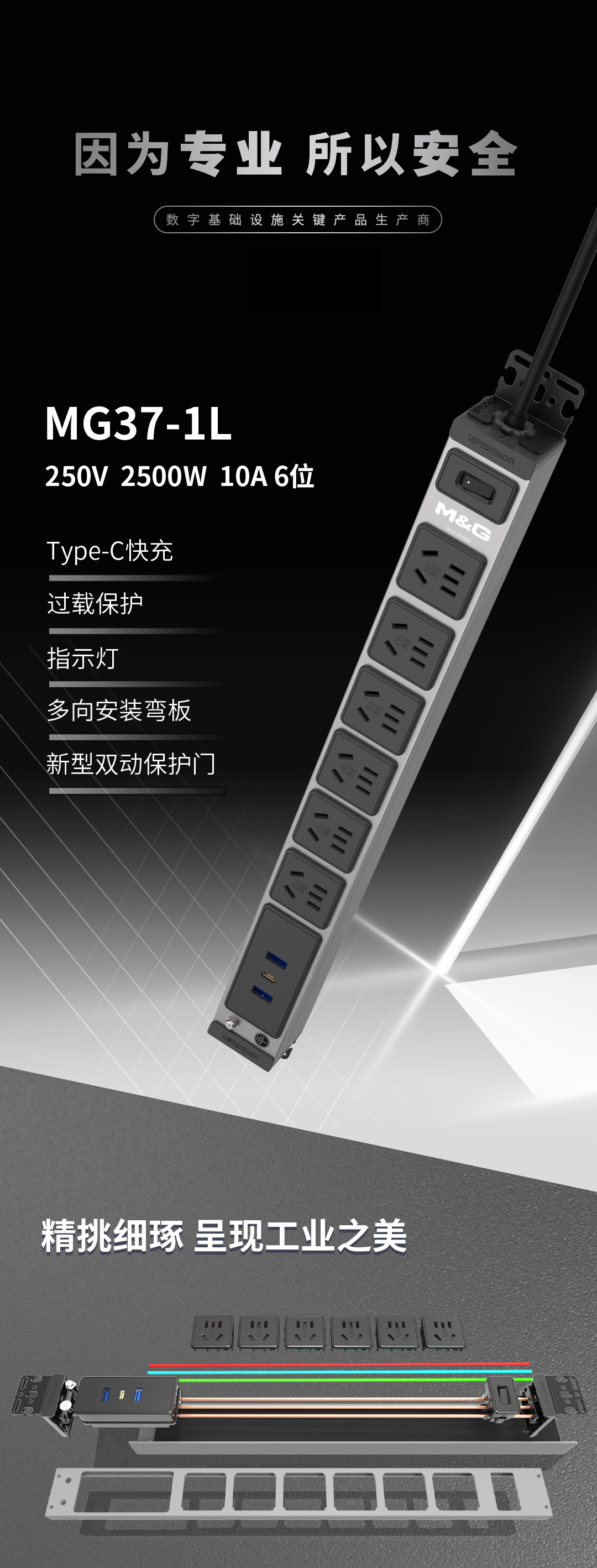 1 品牌为MAKE GREAT(突破电气),型号MG37-1L,包含6位新国标五孔插座及USB输出单元