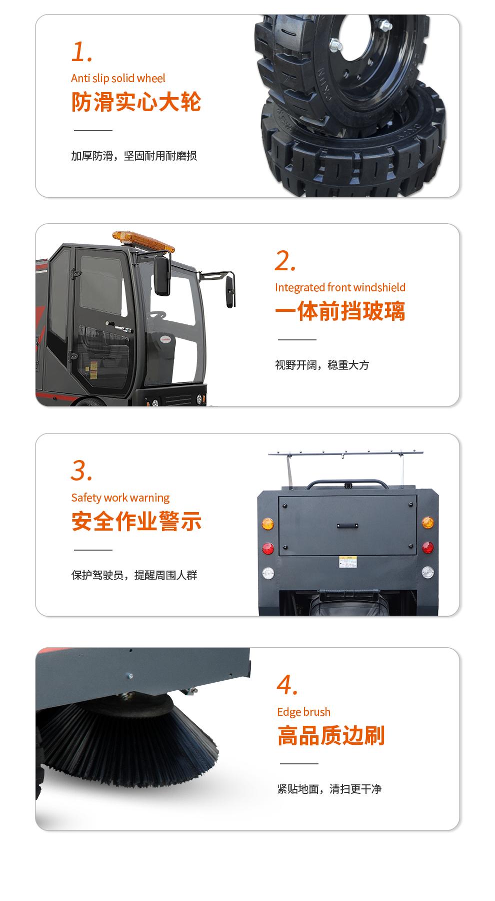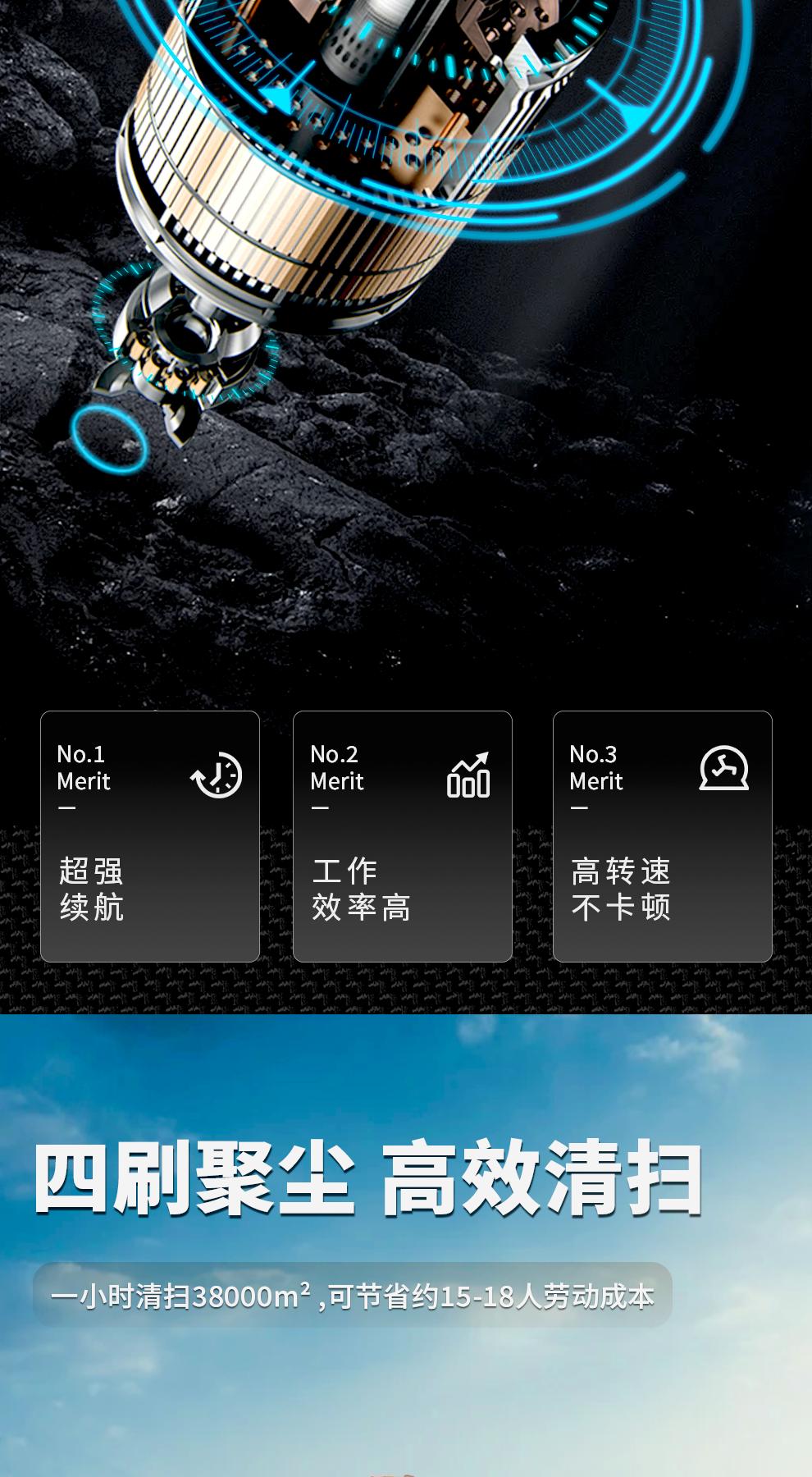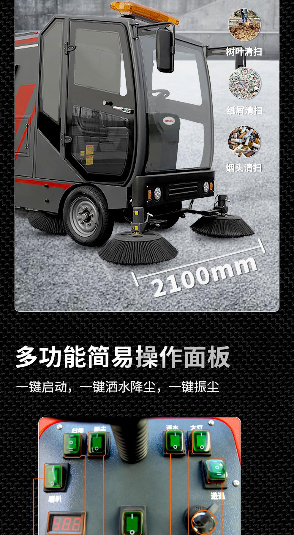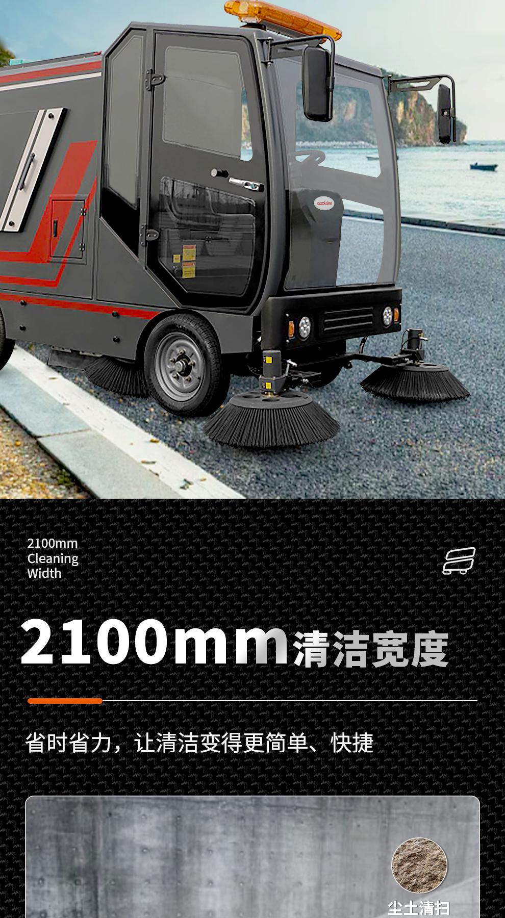 清扫性能:2100mm宽清扫范围,四刷聚尘设计,工作效率高达38000㎡/h,可有效清扫落叶、粉尘、烟头、纸屑等各类轻质垃圾